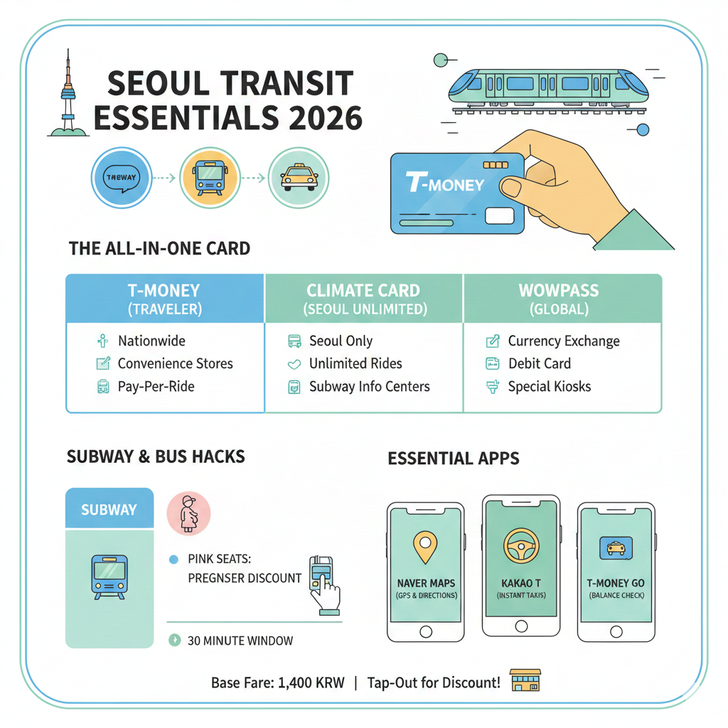 Seoul Travel, Seoul Subway, T-Money, Climate Card, Korea Tourism, Public Transport Guide, Seoul 2026, Travel Tips, Kakao T, WOWPASS, Myeongdong, Gangnam, Incheon Airport to Seoul