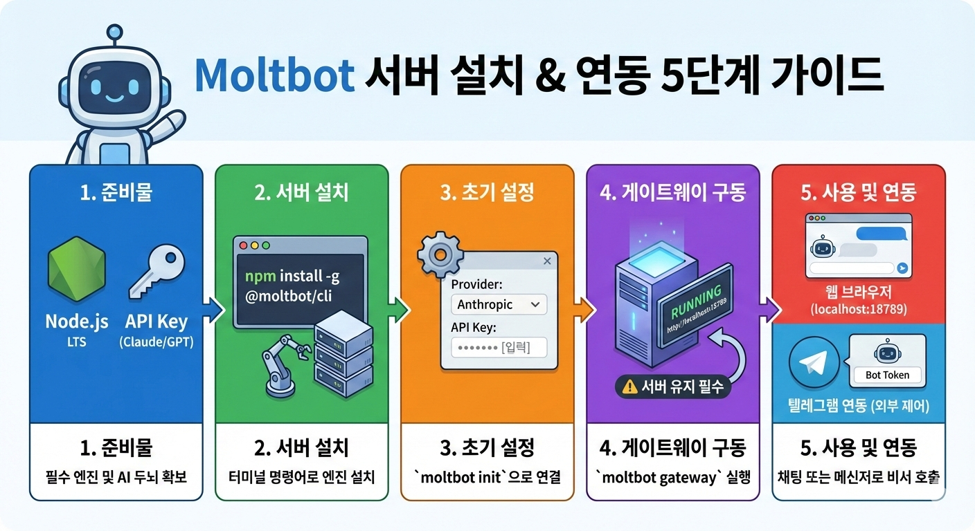- Node.js 설치 -> 2. npm으로 몰트봇 설치 -> 3. init으로 API 키 연결 -> 4. gateway로 서버 실행!